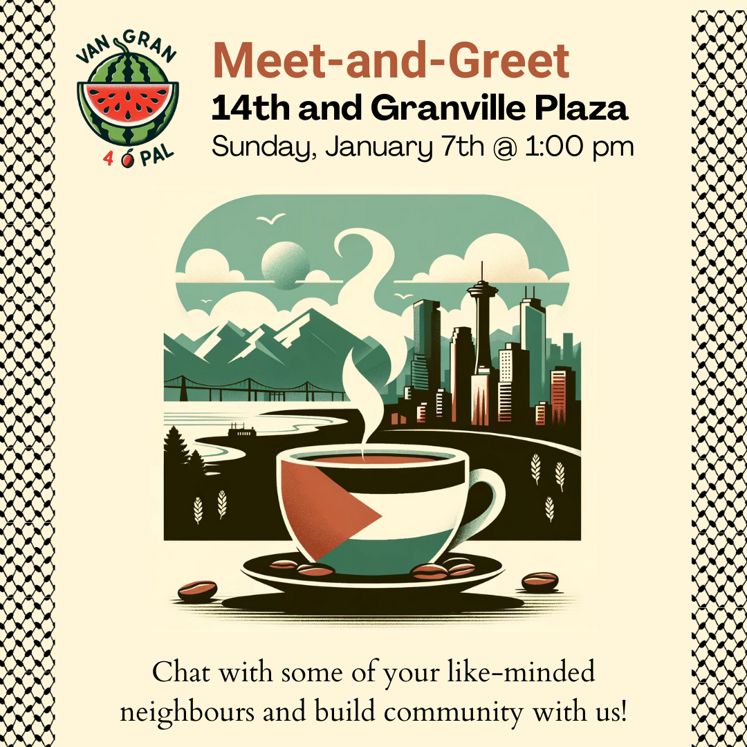 This Sunday at 1:00 p.m., we also invite you to join us at an upcoming, incredibly casual meet-and-greet in our neighbourhood. This is a chance for us to put some faces to names and talk about ways weβd like to contribute as we get ready to execute on a two-month roadmap ahead. We are committed to ensuring that the next representative of Vancouver-Granville stands in solidarity with Palestine and weβd love to have you join us!