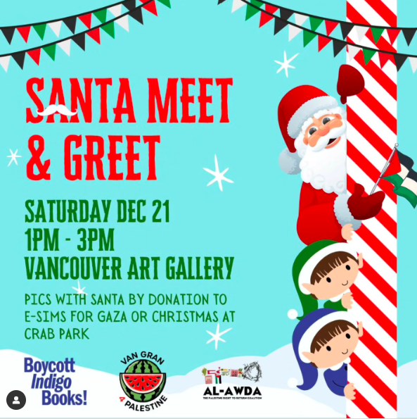 Vancouver Art GallerySanta is coming back to "Vancouver"! 🎅 Bring your family and friends down to the Vancouver Art Gallery for photos with Santa and help us raise funds for E-Sims for Gaza as well as locally for our community in Crab Park.Come down and learn more about the @boycottindigobooks campaign and how to support local businesses.Click here for event details.