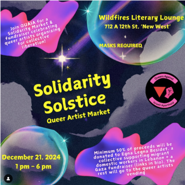 **Wildfires Literary Lounge, 712 A 12th St, ‘New West’. **Looking to spend time this holigay season with rad queers organising for collective liberation? Want to support people in 🇵🇸 & 🇱🇧? Join QUAIA & friends for a Solidarity Solstice Market & fundraiser!! We’ll have amazing queer vendors & beautiful art making led by a queer Colombian artist. Plus some other surprises!