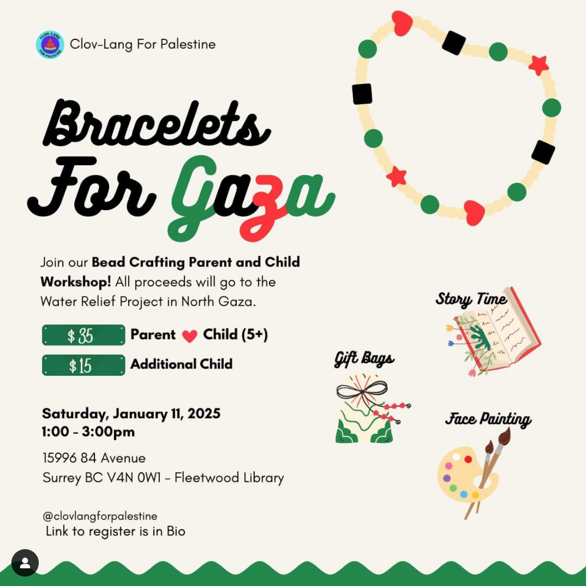 Tickets Here🌟 Bracelets for Gaza: Parent & Child Workshop 🌟From @clovlangforpalestine: Bring your little ones (ages 5+) and join us for a fun and meaningful crafting event to create beautiful bracelets while supporting a vital cause—providing clean water for families in North Gaza! 💧🎨 Activities include:✨ Bracelet making guided by Maryam & Farah🎨 Face painting & craft table❤️ Card making to share hope with a child in Gaza📚 Storytime about Palestine☕ Refreshments & snacksTickets:🎟 Each ticket includes one parent and one child. Want to bring more kids? Purchase an Add-a-Child ticket to include them in the fun!Let’s create, bond, and make a difference together! Reserve your spot now—seats are limited.🔗 Link in @gaza.waterproject bio to register.