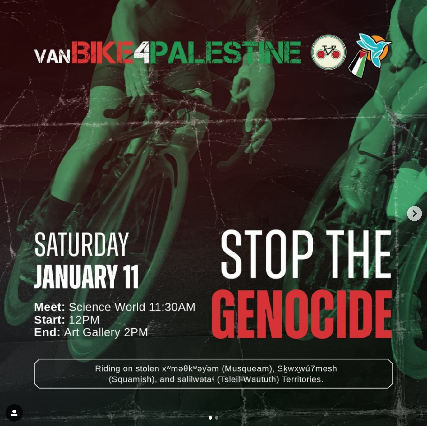 This week’s ride will end at Saturday’s rally, which aims to draw particular attention to Israeli targeting of medical facilities and personnel in Gaza. Our government’s rhetoric on “human rights” and “international law” has rung painfully hollow to the ears of so many of us who bear witness to the horrors it has continually supported by its policy on Palestine and Israel - and especially so to the thousands of Palestinian Canadians who are left asking: does my chosen country hate me?Come ride (and march) with us as we demand our government honour their words, and openly condemn and take action against Israeli targeting of Palestinian medical facilities, and their genocide at large.🇵🇸🇵🇸🇵🇸🇵🇸✊✊✊🍉✊✊✊🇵🇸🇵🇸🇵🇸🇵🇸Meet: 11:30 Science WorldLeave: 12:00End: 2:00 Art Gallery