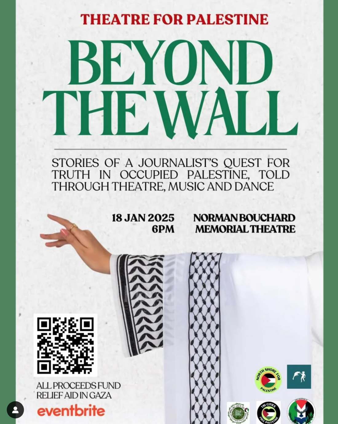 Join us on January 18th, 2025, for Beyond the Wall”, a fundraising theatre at UBC’s Normand Bouchard Memorial Theatre at 6pm! In support of Palestinian families impacted by the ongoing Genocide.