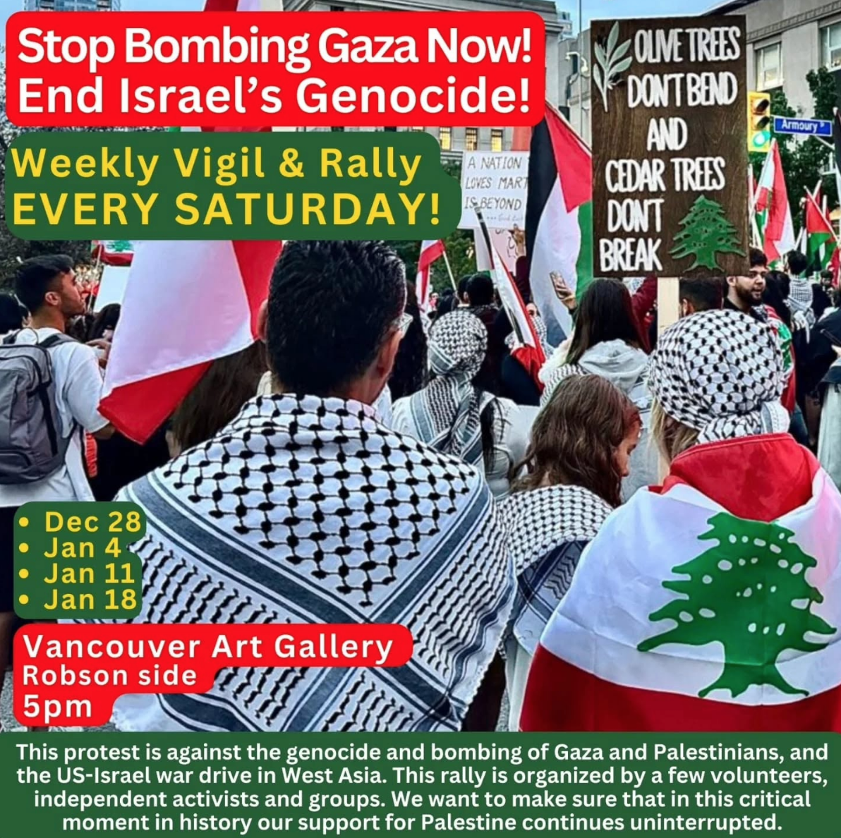 A group of volunteers and independent activists holds a vigil and rally every Saturday outside the Vancouver Art Gallery. It’s easy to drop by, meet your community and stand in solidarity with Palestine.