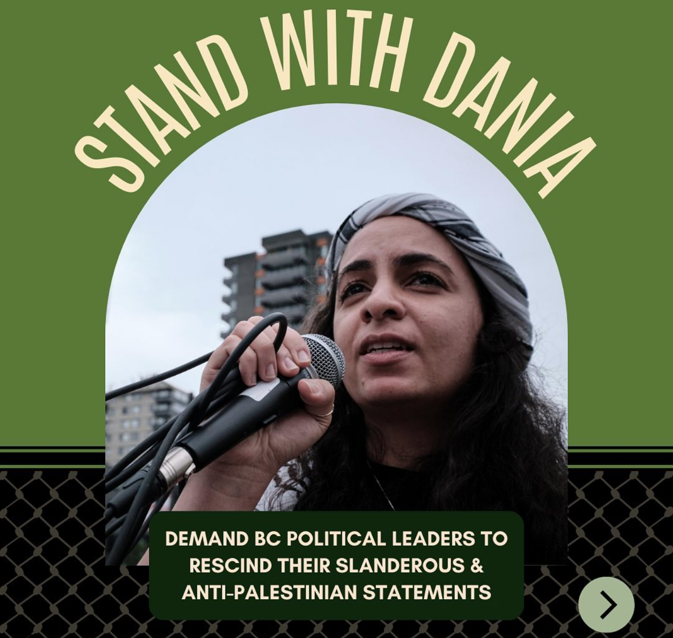 Dania Barakat, a beloved Palestinian member of Vancouver’s community, is facing vicious smears and doxing by pro-Israeli racists after participating in a July 3 protest against Team Israel, who were shamefully welcomed in Surrey to play in the Canada Women’s Softball Cup tournament.We are outraged by the slanderous, anti-Palestinian statements from BC Premier David Eby and BC Green Leader Sonia Furstenau, who echoed baseless claims made by pro-Israeli racists. They misleadingly portrayed the event as a children’s game, when it was, in fact, an adult women’s game.These false narratives aim to defame and de-legitimize Palestinians, and the Palestinian Liberation movement.This is anti-Palestinian racism. Eby and Furstenau’s tweets distract from why the protest took place: to oppose Israel’s horrific genocide on Gaza, which has resulted in over 186,000 Palestinian’s murdered by Israel’s Zionist war cabinet, including over 100 children daily.Eby even retweeted Michael Sachs, Executive Director of the discredited Jewish National Fund, known for its well-documented history of racist and colonial actions in Palestine and links to the Israeli military, and whose charitable status in Canada is under review.Take action now! Sign and share the open letter, calling on Premier David Eby and Sonia Furstenau to rescind their slanderous comments about the protest on July 3 and Dania Barakat, stand against Israel’s war crimes, condemn Zionist settler-colonialism and support the Palestinian community.Sign and share the open letter now!