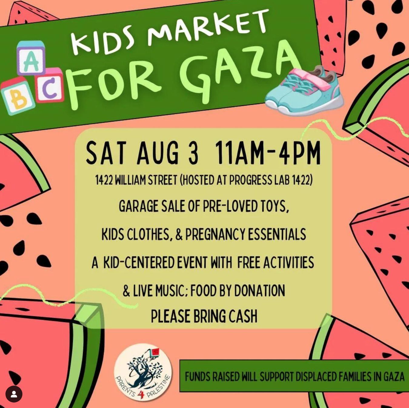 From @parentsforpalestineyvr - Join us on Saturday Aug 3 at the amazing @progress_lab_1422 space for a child-centered, family event. We will be selling gently loved toys, books, and clothes for children of all ages! We'll also have many children's activities and live entertainment. See you there!