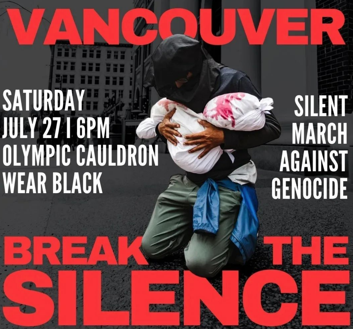 SATURDAY JULY 27TH | 6PM"VANCOUVER" | Unceded Musqueam, Squamish, and Tsleil-Waututh territoriesOLYMPIC CAULDRONWEAR BLACK. TAKE TRANSIT. SHOW UP.186,000 Palestinians in Gaza murdered by the occupiers*. Our government is complicit in war crimes. Words are clearly not enough.Please note:- This march will include visual and audible representations of genocide.- With road closures and increased traffic due to the Festival of Lights, please avoid driving and use public transportation, if possible.- Bring your family and your friends. Now is the time to show up.*According to The Lancet on July 5th, 2024: "Applying a conservative estimate [...] it is not implausible to estimate that up to 186,000 or even more deaths could be attributable to the current [GENOCIDE] in Gaza."