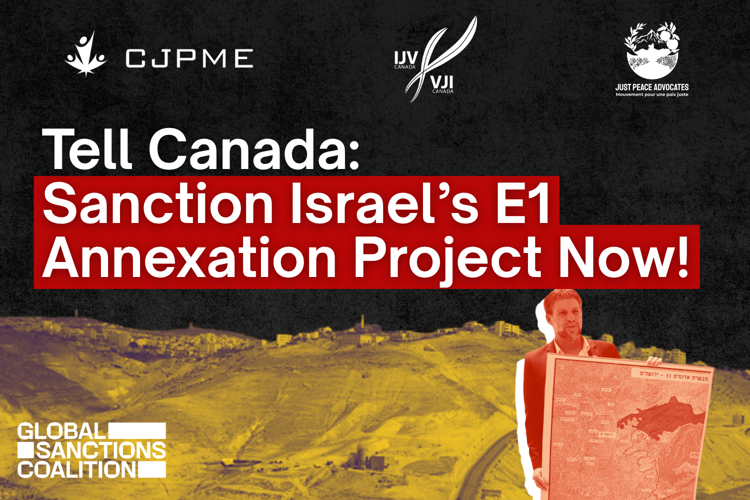 Join us in calling on Prime Minister Mark Carney to sanction Israel’s E1 settlement project before it permanently severs the occupied West Bank in two and consolidates Israel’s unlawful control over Palestinian territory.