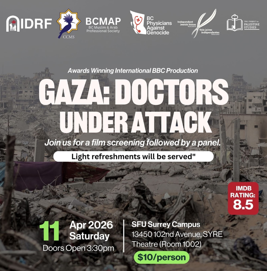 IDRF—in partnership with BC Muslim & Arab Professionals, BC Physicians Against Genocide, Independent Jewish Voices, Centre for Comparative Muslim Studies, and The Project on Palestine Studies—invites you to a special screening of Gaza: Doctors Under Attack, an award-winning documentary examining the realities faced by healthcare workers and the extreme conditions under which medical care continues in Gaza. Followed by a panel discussion with local physicians and an audience Q&A.