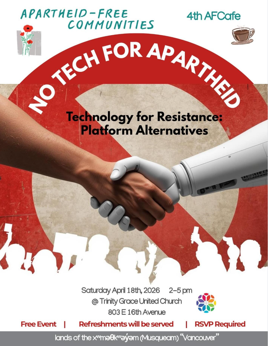 Join Apartheid Free Communities BC for our fourth Apartheid Free Cafe. Technology and social media have become integral to our lives, but as the world drastically changes, so do tech platforms. This leads to questions about the ethics of the platforms we use and the companies we support. Many of the companies that are most complicit in apartheid and other human rights violations in Palestine are giant technology companies like Google and Microsoft. So what options do we have?